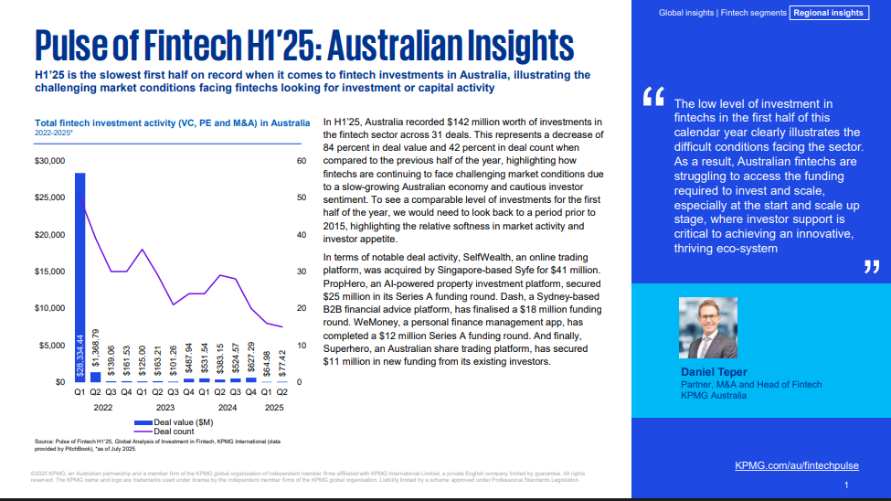 On the funding front, Australian fintechs received a total of $142 million in investments across 31 deals in the first half of 2025. Compared with the previous half, this represented an 84% decline in deal value and a 42% decline in the number of deals.
